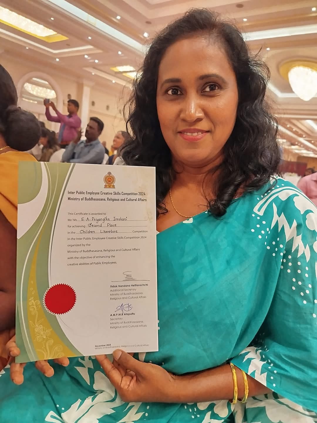 ළමා කතා නිර්මාණ අංශයේ දෙවන ස්ථානය ලබාගනිමින් සම්මානයට පාත්රවූ බලපිටිය ප්රාදේශීය සභාවේ සංවර්ධන නිළධාරී ඊ.ඒ.පී ඉරෝෂනී මියට බලපිටිය ප්රාදේශීය සභා ලේකම්තුමිය ඇතුළු කාර්ය මණ්ඩලයේ සියලු දෙනාගේම සුභාසිංශන එක් කරමු