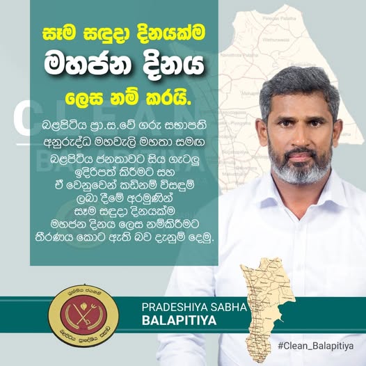 *Clean sri lanka – ලස්සන වෙරළට තීරයක් සහ ආකර්ෂණීය සංචාරක ගමනාන්තයක් ඇති කිරීම සඳහා වන වැඩසටහන* යටතේ බලපිටිය කොට්ඨාසයේ වෙරළ තීරයේ කොස්ගොඩ, අහුන්ගල්ල, බ්රහ්මණවත්ත, වැල්ලවත්ත යන ස්ථාන 4 පිරිසිදු කිරිම අද දින සිදු විය. ශ්රි ලංකා යුධ හමුදාවේ බුස්ස කඳවුර මගින් මුලික සංවිධාන කටයුතු සිදු කෙරුණු මෙම වැඩසටහන සඳහා පහසුකම් සැපයිම සහ වැඩසටහන මෙහෙයවිම බලපිටිය…