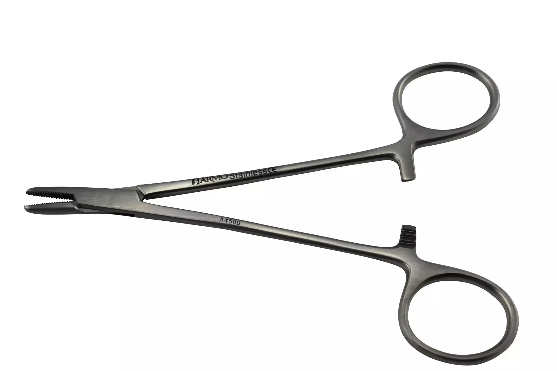 Derf needle holders feature short jaws and a fine cross-hatched pattern on the jaws that are suitable for small suture needles (commonly 5-0 and 6-0 sutures). Often utilized in ophthalmic, dental, or plastic surgery procedures.